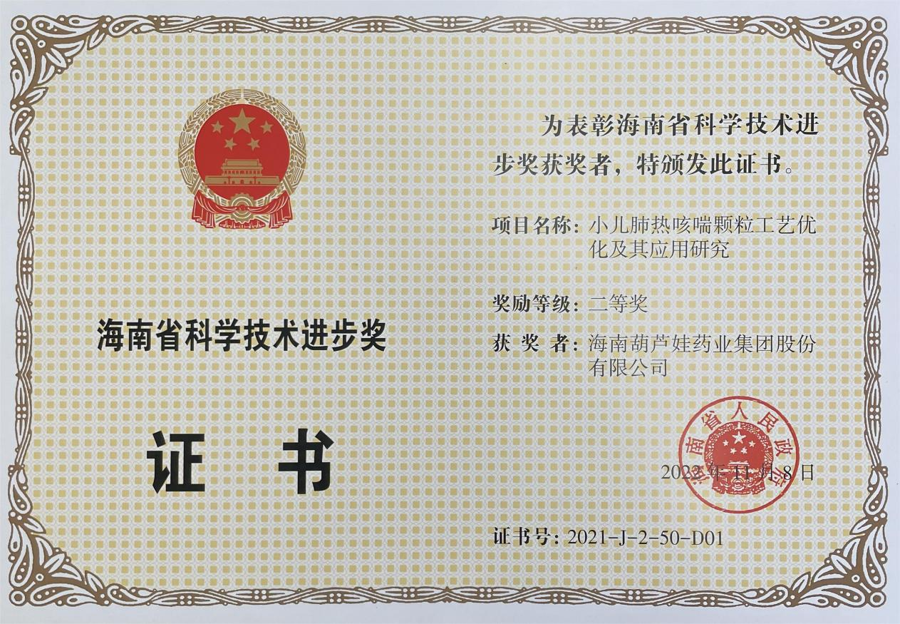 为此,小儿肺热咳喘颗粒的制备方法获得了第二十一届中国专利优秀奖(2019年),专利申请号:ZL201010134951,此次作为专利技术的应用,获得了2021年度海南省科学技术进步奖二等奖。在此之前,PA视讯牌小儿肺热咳喘颗粒还多次被授予“临床价值中成药品牌”、“中国连锁药店最具合作价值单品”,荣登“中国医药品牌榜”。